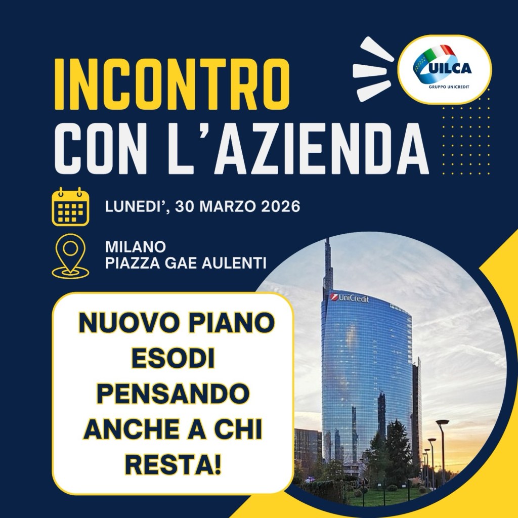 Lunedì 30 marzo si è tenuto il primo incontro legato alle previsioni dell’art 7 dell’accordo 30 dicembre 2025 che ha previsto un nuovo piano di incentivazione all’esodo: l’azienda ha chiarito che riguarderà 1.130 colleghe/colleghi, di cui circa 200 con diritto immediato alla pensione, tramite lo sperimentato meccanismo di incentivazione.